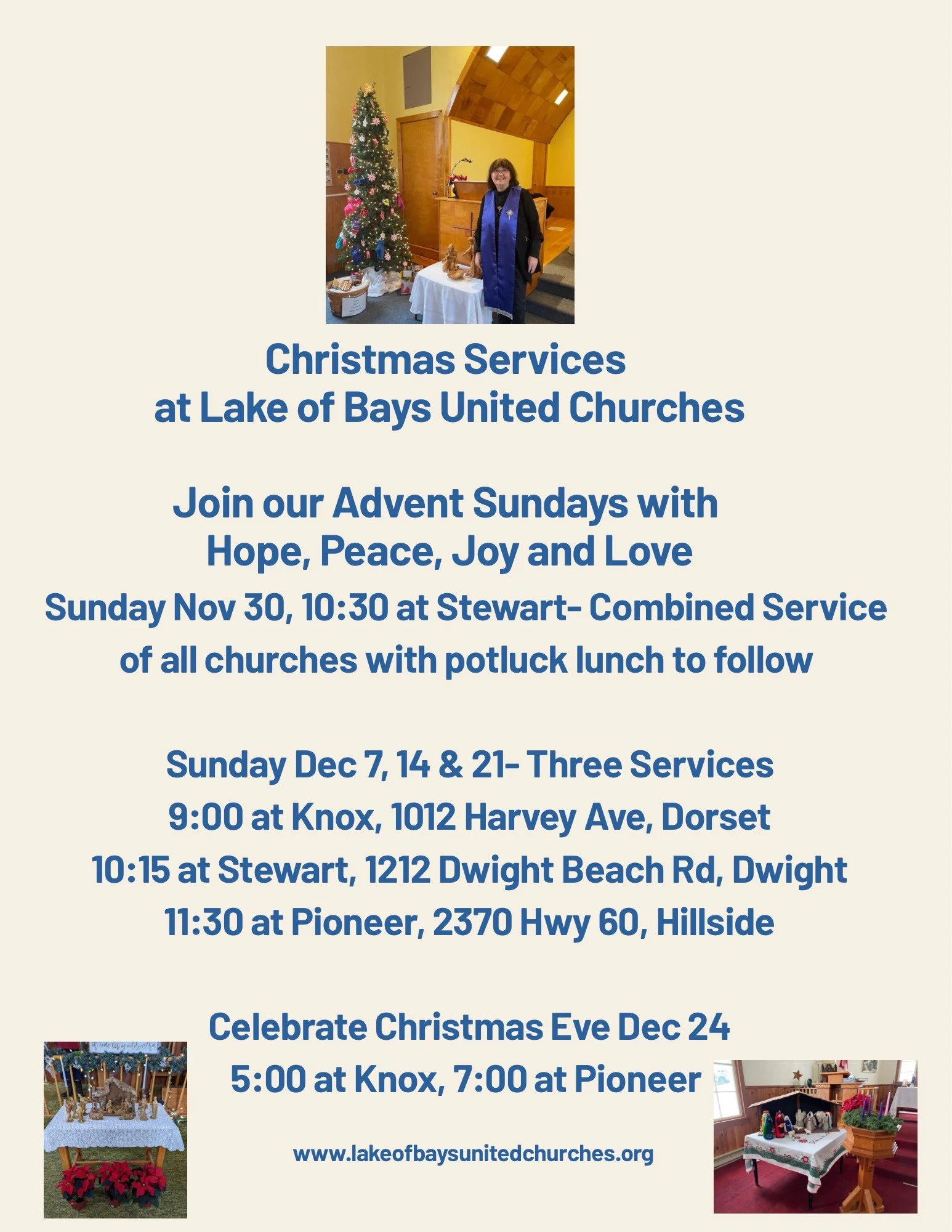 Pioneer Memorial United Church is located at 2370 Hwy #60 (at the foot of Tally-Ho Winter Park Road) Hillside, Lake of Bays