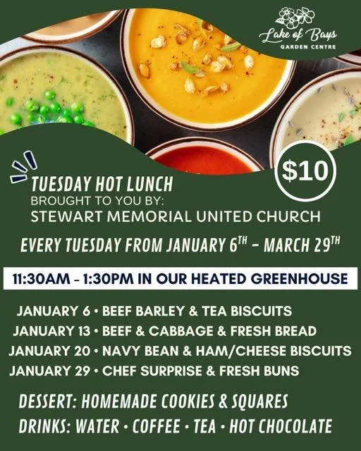 Stewart Tuesday’s Hot Lunch at LOB Garden Centre- Jan 6-Mar 31, 11:30-1:30