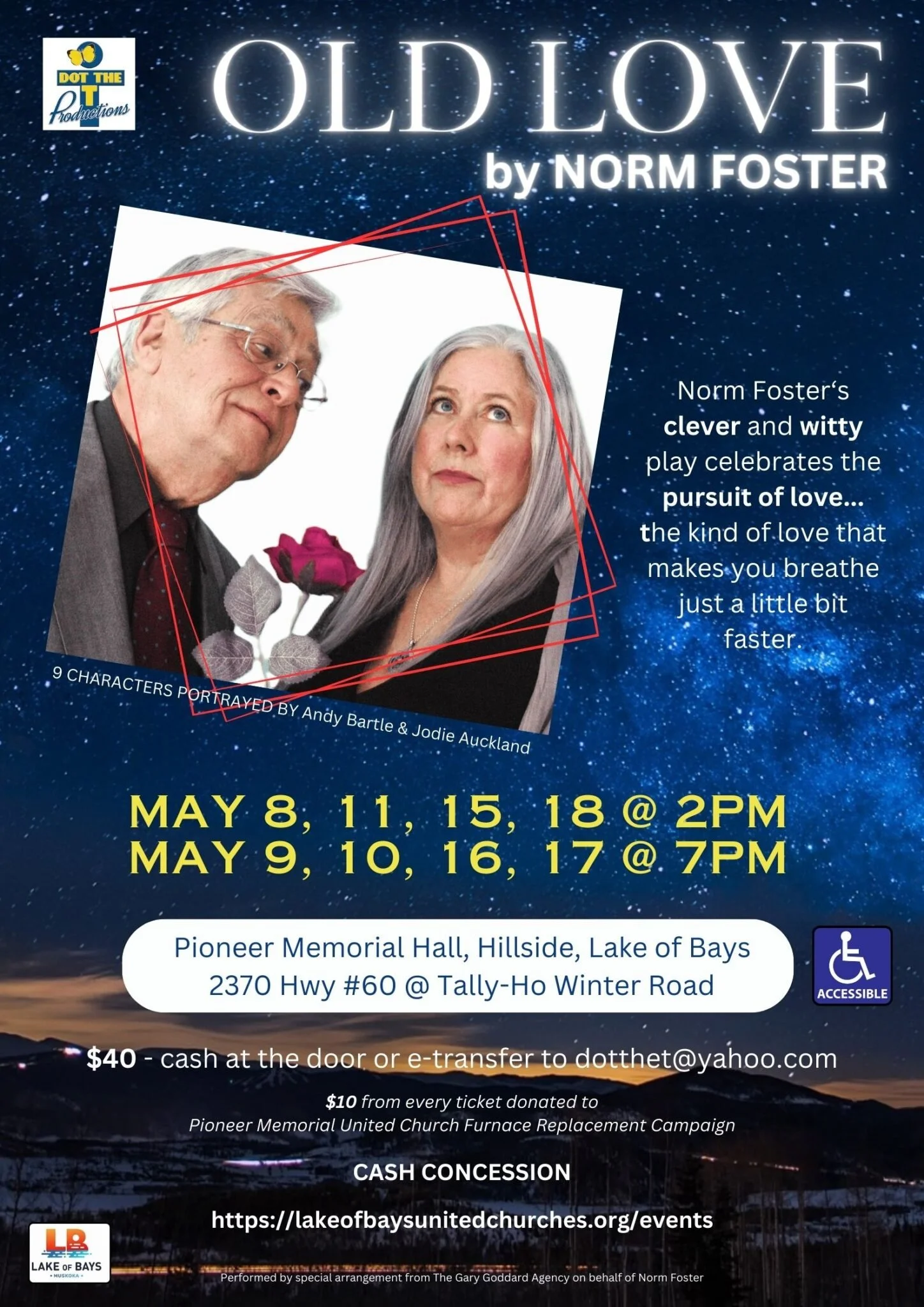 It began when Dot the T Productions’ Artistic Director, Jan Jacklin, attended a Sunday service in December. In conversation with Scott Winchester, a member of Pioneer Memorial United Church’s congregation, she learned from Scott (who also volunteers with building maintenance) that the church’s furnaces were well past their shelf life and would soon need to be replaced. It was then that Jan offered Reverend Jordan a solution. It was agreed that the utilization of these cultural community hubs and the performing arts would be a natural fit. Additionally, showcasing these local landmarks with professional events would attract people to Lake of Bays. Both church and local businesses would benefit from this influx.