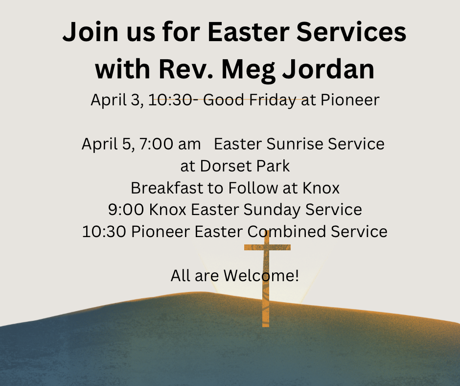 Easter Sunday begins at 7:00 am at the Dorset Park with a Sunrise Service followed by breakfast at Knox United Church, 1012 Harvey Avenue, Dorset.